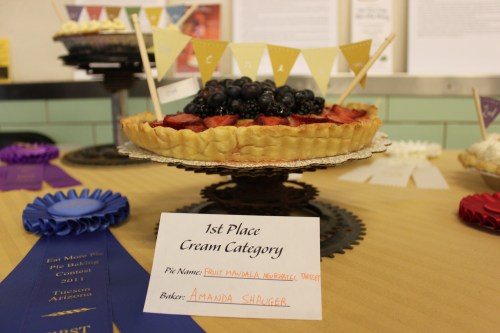 The pictures accompanying this post are from Tucson’s Annual Pie Party, where dozens of Tucsonans labor over a hot stove in the May heat to bake pies. Pies are then judged and given awards by category. I’ve been thinking about awards and ribbons lately as we were judging the contest and preparing to announce the awardees and as I have been watching the Summer Olympics many evenings. Do you know where the tradition of giving blue ribbons for first place comes from? It comes from The Blue Riband, the honor awarded the passenger ship crossing the Atlantic Ocean against the Gulf Stream with the record highest speed. Before that, the Blue Riband was given out in horse racing. But the tradition of blue ribbons being associated with excellence and nobility goes back even farther to the Cordon Bleu: the name given to the blue ribbons worn by an order of knights. Second place ribbons are red and third place are yellow. All primary colors. I was unable to find information on why red and yellow are given for second and third place.